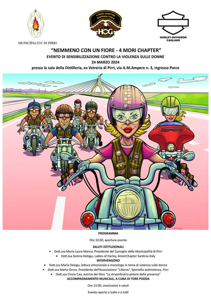 Un'impegno costante per i diritti delle donne e contro la violenza di genere trova espressione in un evento ideato e realizzato dalle donne dell'Associazione 4 Mori Chapter Sardinia Italy, in collaborazione con la Municipalità di Pirri. Intitolato “Nemmeno con un fiore”, l'evento punta i riflettori sulla violenza contro le donne per sensibilizzare la comunità contro questo fenomeno dilagante.
