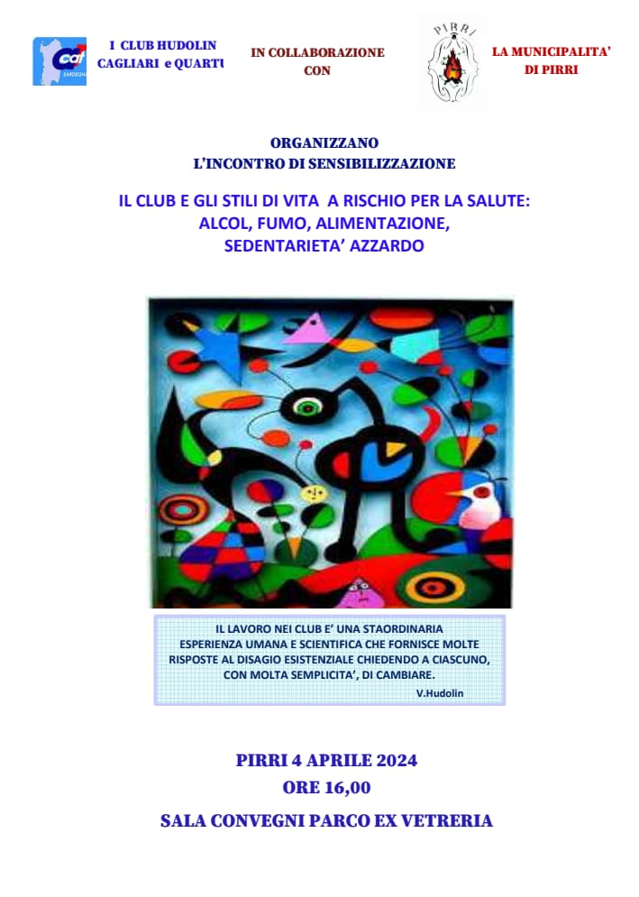 Il primo evento, in collaborazione con i Club Hudolin di Cagliari e Quartu, si terrà giovedì 4 aprile nella Sala Convegni del Parco Ex Vetreria. Con l’inizio dei lavori previsto per le ore 16, l’incontro sarà il punto di partenza per una serie di appuntamenti successivi, che approfondiranno ogni singola tipologia di dipendenza.