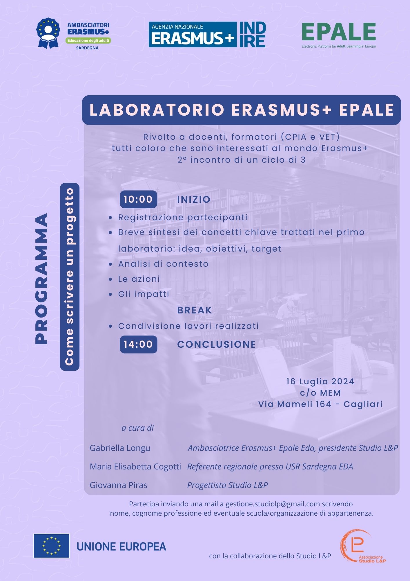 Martedì 16 luglio 2024 a partire dalle 10, la Sala Eventi al 2° piano della MEM – Mediateca del Mediterraneo di via Mameli 164 a Cagliari, ospita il secondo incontro del ciclo di “Laboratori di progettazione europea Erasmus+. Come scrivere un progetto”.