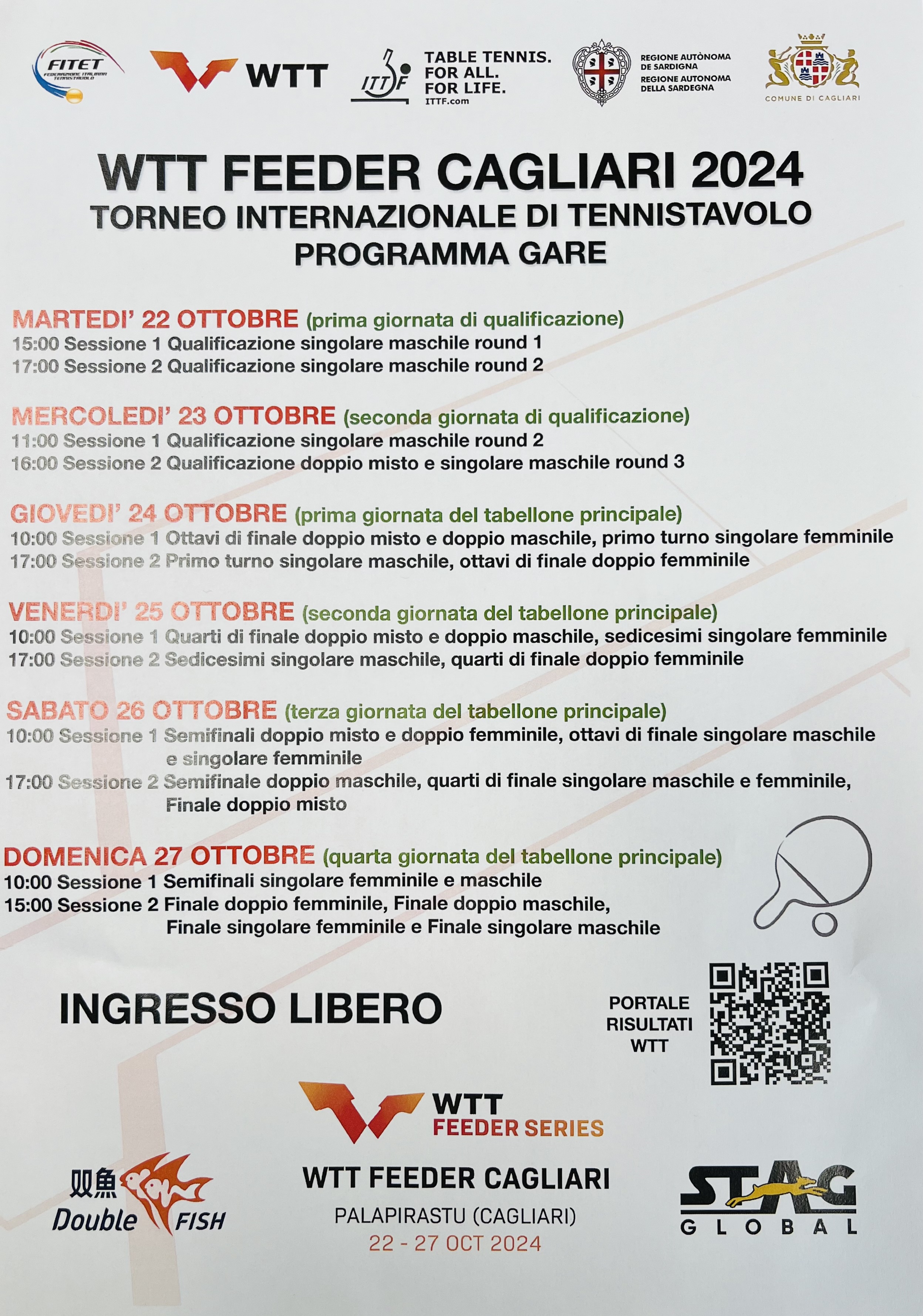 “Organizzare per la prima volta in Sardegna una manifestazione internazionale di tennistavolo come WTT Feeder Cagliari 2024 è sicuramente una bella e impegnativa sfida. Ma è anche un'occasione importante per promuovere lo sport e il territorio”, ha detto Simone Garrucciu, presidente della FITeT Sardegna rimarcando la proficua partnership del Comune di Cagliari e della Regione.