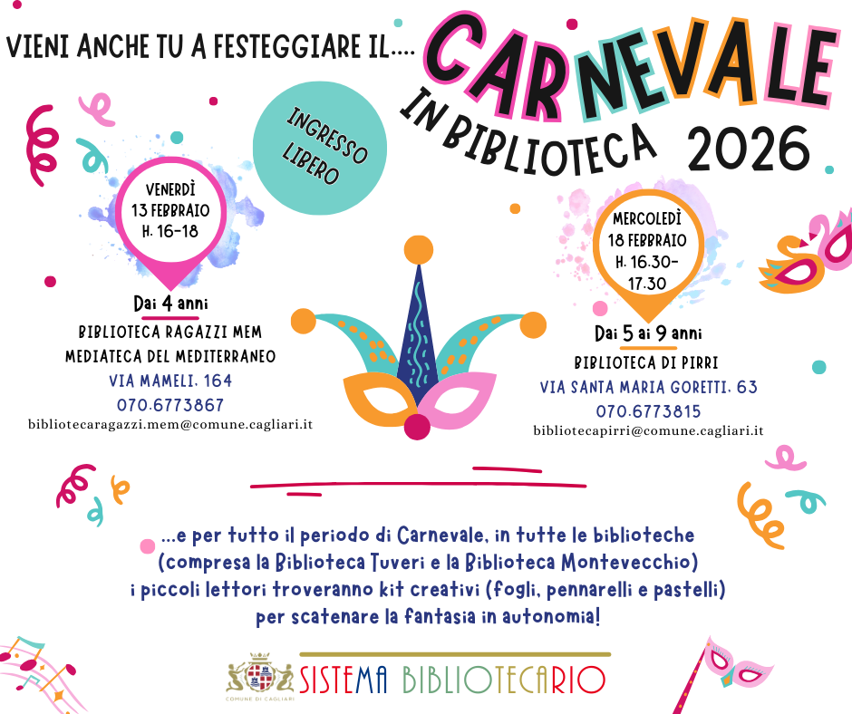 Letture animate, attività creative e stelle filanti: il Sistema bibliotecario comunale di Cagliari organizza una serie di laboratori per il Carnevale 2026 dedicati alle bambine, ai bambini e ai loro accompagnatori, con le biblioteche che diventano spazi di festa e condivisione. Il programma prevede laboratori di lettura e attività creative a tema.
