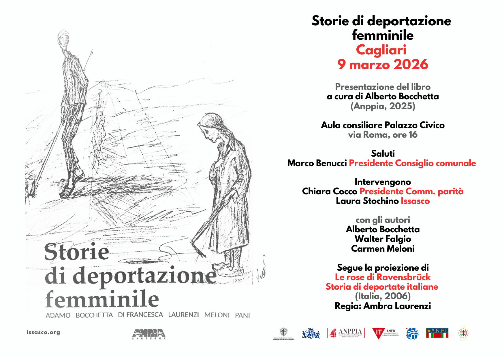 Nel pomeriggio, a partire dalle 16, nell’aula consiliare del Palazzo Civico in via Roma la presentazione pubblica del volume “Storie di deportazione femminile” (Anppia, 2025, a cura di Alberto Bocchetta), sulle vicende biografiche di donne perseguitate dal nazifascismo, con particolare attenzione al “Trasporto 91” diretto a Ravensbrück nell’ottobre del 1944. Parteciperanno, con gli autori Bocchetta, Falgio, Pani e Meloni, il presidente del Consiglio comunale Marco Benucci, la presidente della commissione Pari Opportunità Chiara Cocco e, in veste di rappresentante dell'Issasco, la consigliera Laura Stochino.