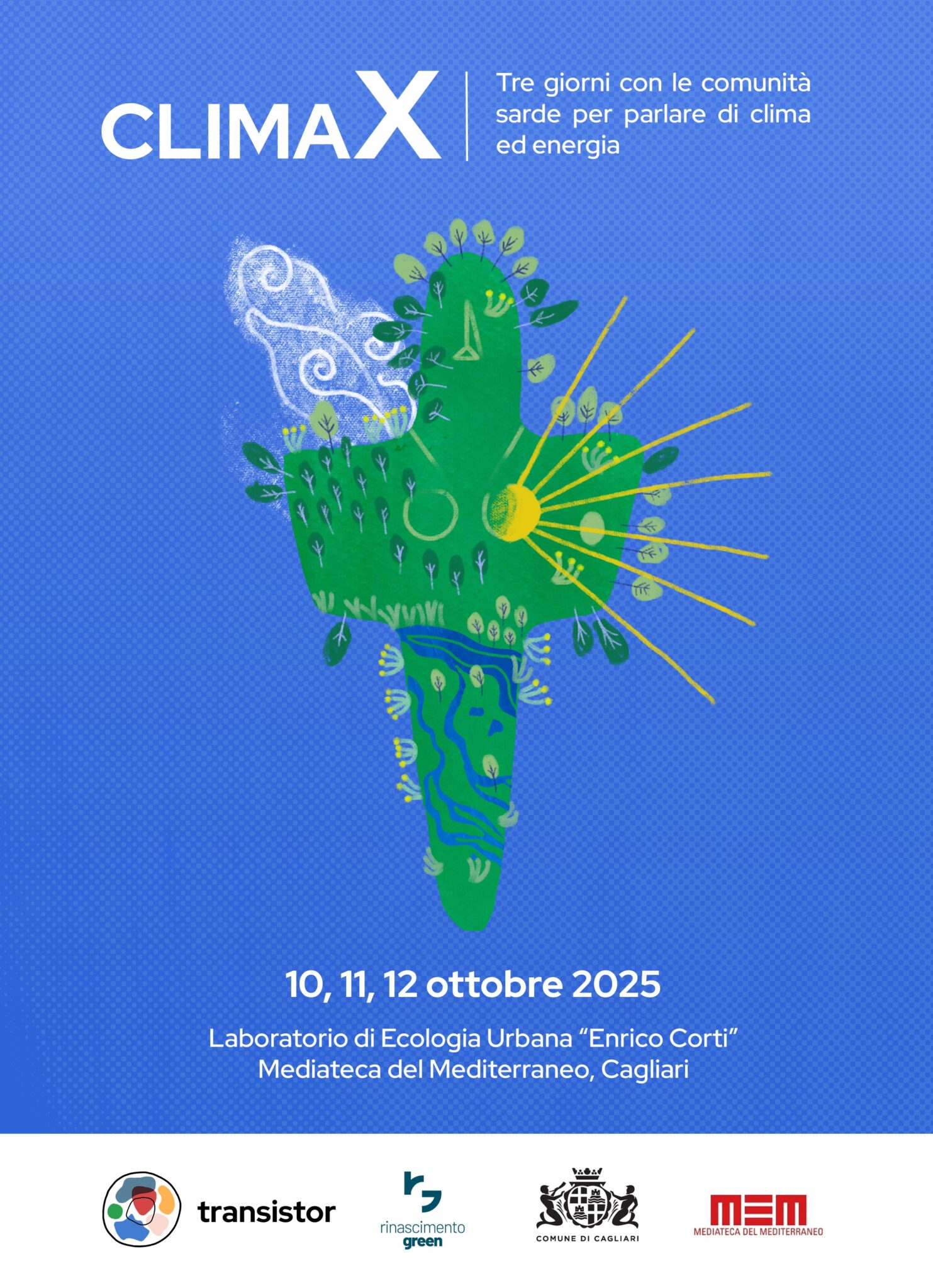 Venerdì 10 (dalle 14.30 alle 19.30), sabato 11 (dalle 9 alle 19.30) e domenica 12 (dalle 9 alle 13.30) ottobre 2025, il Laboratorio di Ecologia urbana “Enrico Corti” ospita alla MEM - Mediateca del Mediterraneo di Cagliari, in via Mameli 164, l’iniziativa ClimaX, un percorso collettivo di ascolto, confronto e proposizione di azioni concrete per la transizione energetica. L'ingresso libero.
