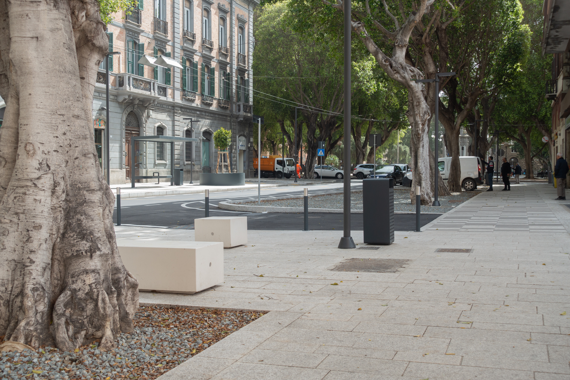 L'intervento permette, inoltre, che le aree pedonali siano valorizzate con una vegetazione arbustiva di tipo mediterraneo per fornire maggiore protezione dall'impatto dei veicoli e garantire qualità e confort agli spazi pubblici.